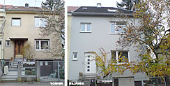 Mit der Planung für diese Doppelhaushälfte wurde begonnen als die andere Doppelhaushälfte verkauft und bereits ohne Architekt mittels Generalunternehmer saniert wurde. Nach kurzer Zeit stellte sich jedoch heraus, dass in der Nachbarhälfte gravierende Mängel der scheinbaren energetischen Sanierung zu Hauf vorhanden waren. Nach Bauteilöffnung aller wichtigen Detailpunkte wurde klar, dass die beauftragte Firma in allen Bereichen ohne jeden Sachverstand gepfuscht hatte. Mittels Sachverständigem und Anwalt klagte der Nachbar sein Recht auf ein mängelfreies Bauwerk ein. Die Konsequenz: Das gesamte Dach inklusive Dämmung und die komplette Außenwanddämmung wurden wieder rückgebaut. Als die Haushälfte unseres Bauherren mittels professioneller Planung, Ausschreibung, Bauleitung und fachgerechter Ausführung energetisch ertüchtigt wurde, begann der Sanierungsprozess mit der gleichen Firma beim Nachbarn noch einmal von vorne! Allerdings nicht ohne erneute Komplikationen und Intervention des Sachverständigen. Nach Fertigstellung unseres Projektes war das Nachbarhaus noch immer eingerüstet. Der Beweggrund unseres Bauherren für eine Sanierung mit erfahrenem Planer war auch „die Schäden des Nachbarn zu vermeiden“ (Zitat). Ganz nebenbei ist ein Gebäude entstanden, das aufgrund der Reduktion der Schallbelastung durch den Flugverkehr des Frankfurter Flughafens und aufgrund des niedrigen Energiebedarfs den Bewohnern neue Behaglichkeit schenkt.