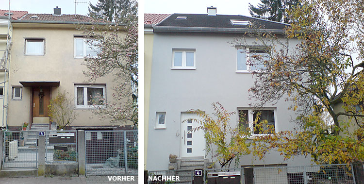 Mit der Planung für diese Doppelhaushälfte wurde begonnen als die andere Doppelhaushälfte verkauft und bereits ohne Architekt mittels Generalunternehmer saniert wurde. Nach kurzer Zeit stellte sich jedoch heraus, dass in der Nachbarhälfte gravierende Mängel der scheinbaren energetischen Sanierung zu Hauf vorhanden waren. Nach Bauteilöffnung aller wichtigen Detailpunkte wurde klar, dass die beauftragte Firma in allen Bereichen ohne jeden Sachverstand gepfuscht hatte. Mittels Sachverständigem und Anwalt klagte der Nachbar sein Recht auf ein mängelfreies Bauwerk ein. Die Konsequenz: Das gesamte Dach inklusive Dämmung und die komplette Außenwanddämmung wurden wieder rückgebaut. Als die Haushälfte unseres Bauherren mittels professioneller Planung, Ausschreibung, Bauleitung und fachgerechter Ausführung energetisch ertüchtigt wurde, begann der Sanierungsprozess mit der gleichen Firma beim Nachbarn noch einmal von vorne! Allerdings nicht ohne erneute Komplikationen und Intervention des Sachverständigen. Nach Fertigstellung unseres Projektes war das Nachbarhaus noch immer eingerüstet. Der Beweggrund unseres Bauherren für eine Sanierung mit erfahrenem Planer war auch „die Schäden des Nachbarn zu vermeiden“ (Zitat). Ganz nebenbei ist ein Gebäude entstanden, das aufgrund der Reduktion der Schallbelastung durch den Flugverkehr des Frankfurter Flughafens und aufgrund des niedrigen Energiebedarfs den Bewohnern neue Behaglichkeit schenkt.