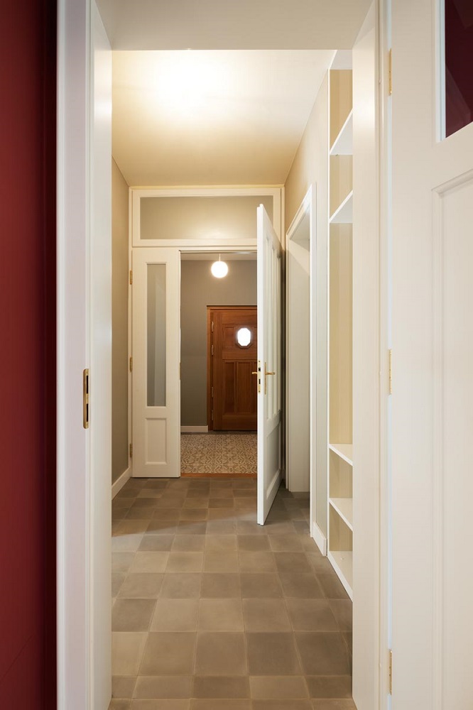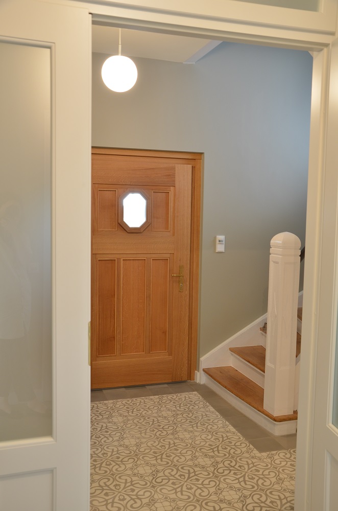 Anhand von zwei letzten erhaltenen Fenstern konnte die ursprüngliche Aufteilung der Sprossenfenster mit Holzklappläden rekonstruiert werden. In aufwendiger Detailarbeit am 1:1 Modell gelang es auch, das Oval im Treppenhaus in identischer Proportion in die Zukunft zu retten: mit 3-fach-Verglasung! Denn der Stand von 1927 (Einfachverglasung) konnte nicht das Ziel sein. Das gesamte Ensemble erreicht das KfW-Effizienzhaus-70-Niveau und übertrifft damit den aktuellen Baustandard deutlich. Dank akribischer Detailplanung und Baubegleitung konnte die ursprüngliche Proportion und das historische Erscheinungsbild mit filigraner Dachkante trotz erhöhtem Dämmstandard wiederhergestellt werden.