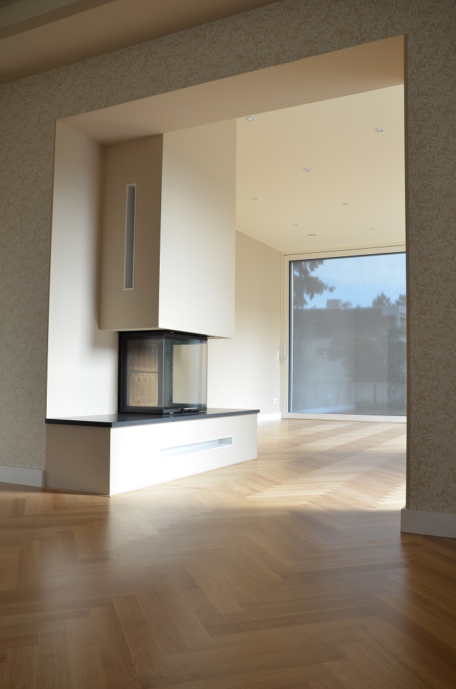 Als Erweiterung wurde dem in neuem Glanz erstrahlten Kleinod ein schlichter Kubus mit großen Verglasungen zum Garten zur Seite gestellt. Durch die Anpassung der Grundrisses konnten auch zeitgemäße Wohnansprüche erfüllt werden. Eine zentrale Lüftungsanlage mit Wärmerückgewinnung und ein Pelletkessel mit Fußbodenheizung sorgen für den zukunftsfähigen Komfort.