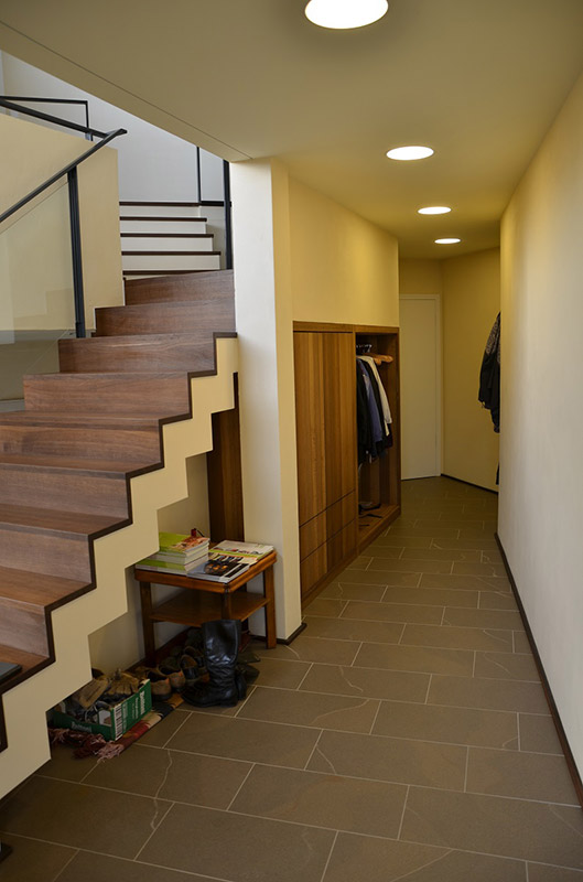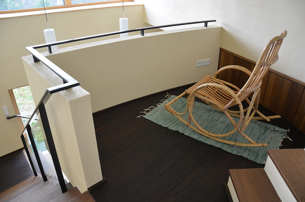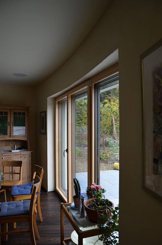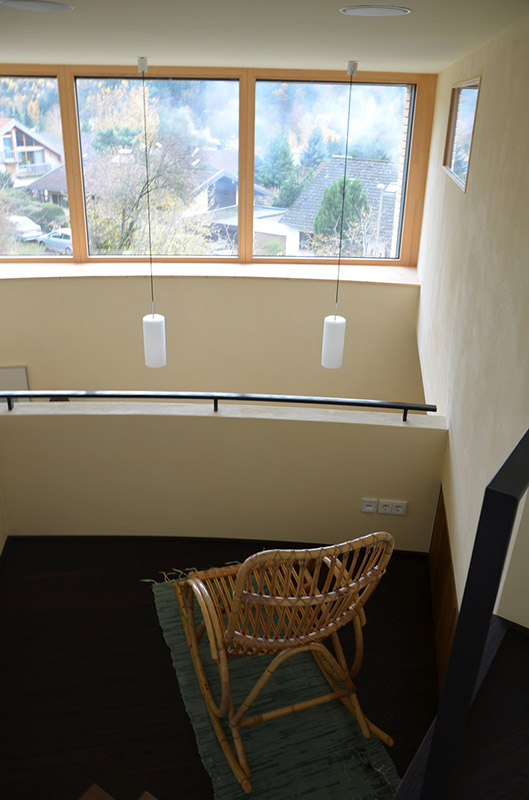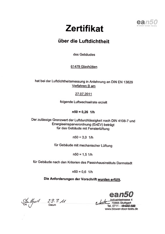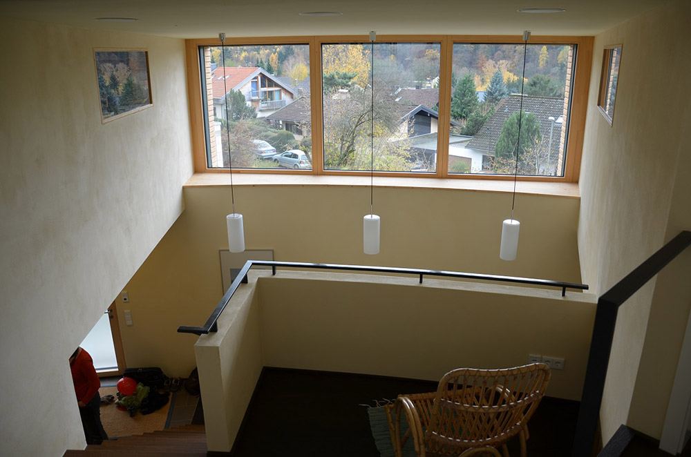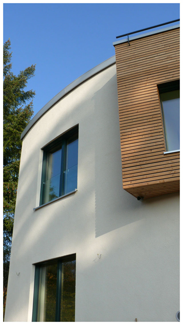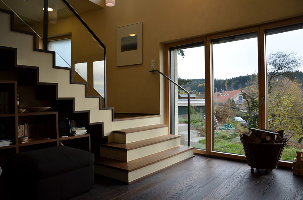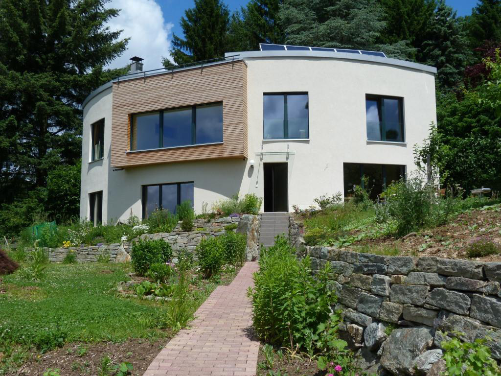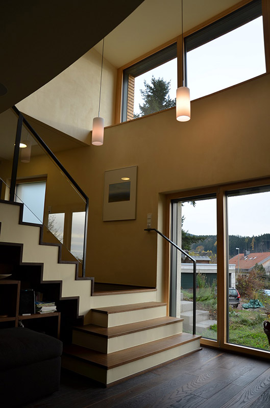 Das Gebäude wird im Passivhausstandard errichtet. Es zeichnet sich durch einen besonders geringen Energiebedarf und Ressourcenschonung aus. Das Erreichen dieses Standards ist maßgeblich von dem kompakten Gebäudekörper und der Maximierung der solaren Energiegewinne des Gebäudes abhängig. Um dieses von den Bauherren gewünschte Ziel zu erreichen, wurde das Gebäude in der vorliegenden kompakten Form entworfen. Es passt sich dem Geländeverlauf und der besonderen Grundstückstopografie (Westhanggrundstück) an. Die Form ist dem Sonnenverlauf angepasst, um die solaren Gewinne zu optimieren. Darüber hinaus ist eine Regenwassernutzung vorgesehen.