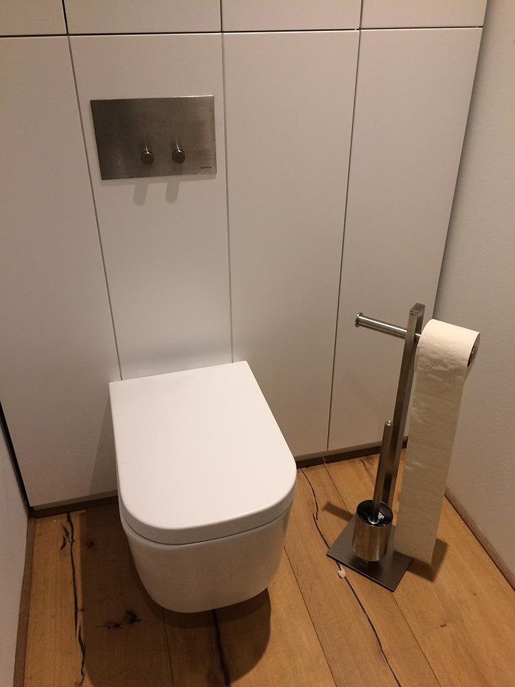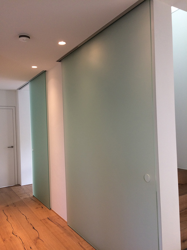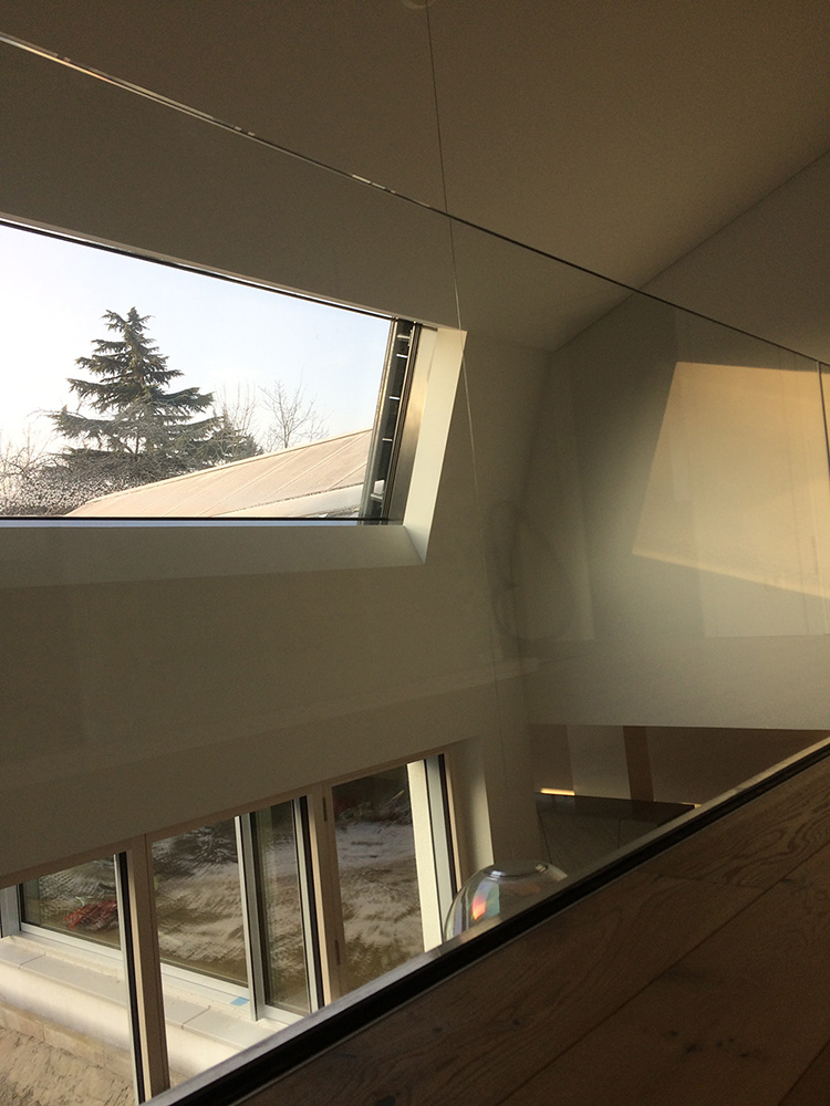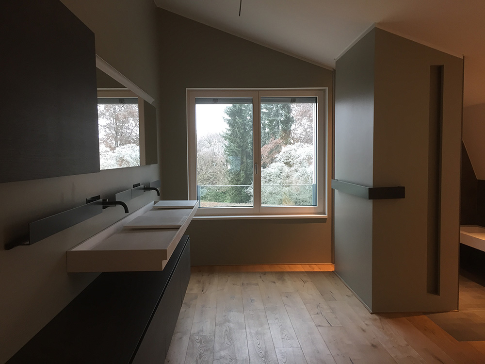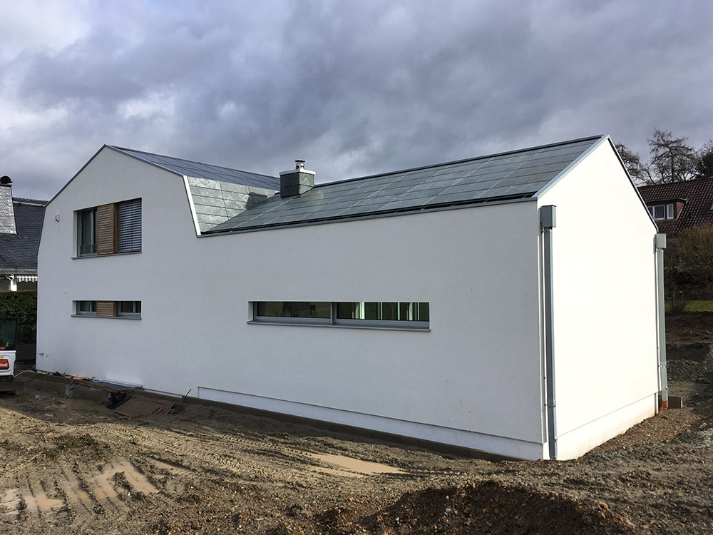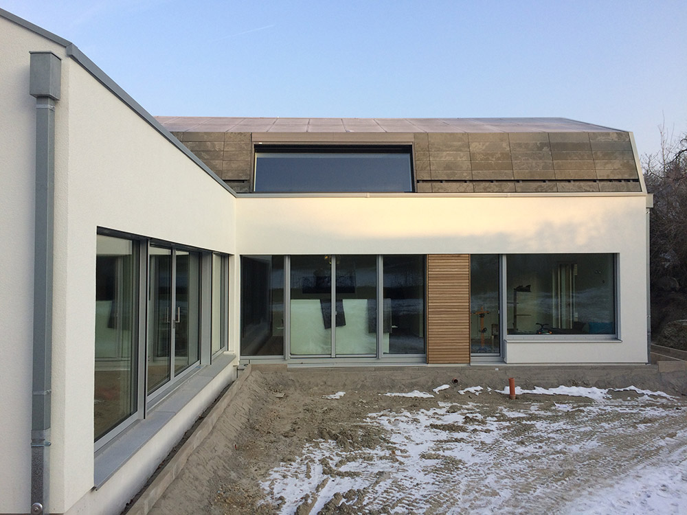 Die gewählte Dachform ermöglicht eine optimale Ausnutzung des Dachgeschosses unter Einhaltung diverser Vorgaben. Die Dachneigung von 20-30 ⁰ bietet zudem sehr günstige Voraussetzungen für die Photovoltaik-Nutzung auf der Südseite. Jenseits dieser funktionalen Rahmenbedingungen lag in der Detailarbeit besonderes Augenmerk auf dem minimalistischen Erscheinungsbild des Daches. Die graugrünen Schieferplatten wurden nach Plan zugeschnitten und nehmen exakt die Fugen der PV-Module auf, die bündig in die Dachfläche integriert sind. Die klare Linienführung zieht sich durch den gesamten Entwurf und verleiht dem Gebäude ein modernes, zeitloses Aussehen.