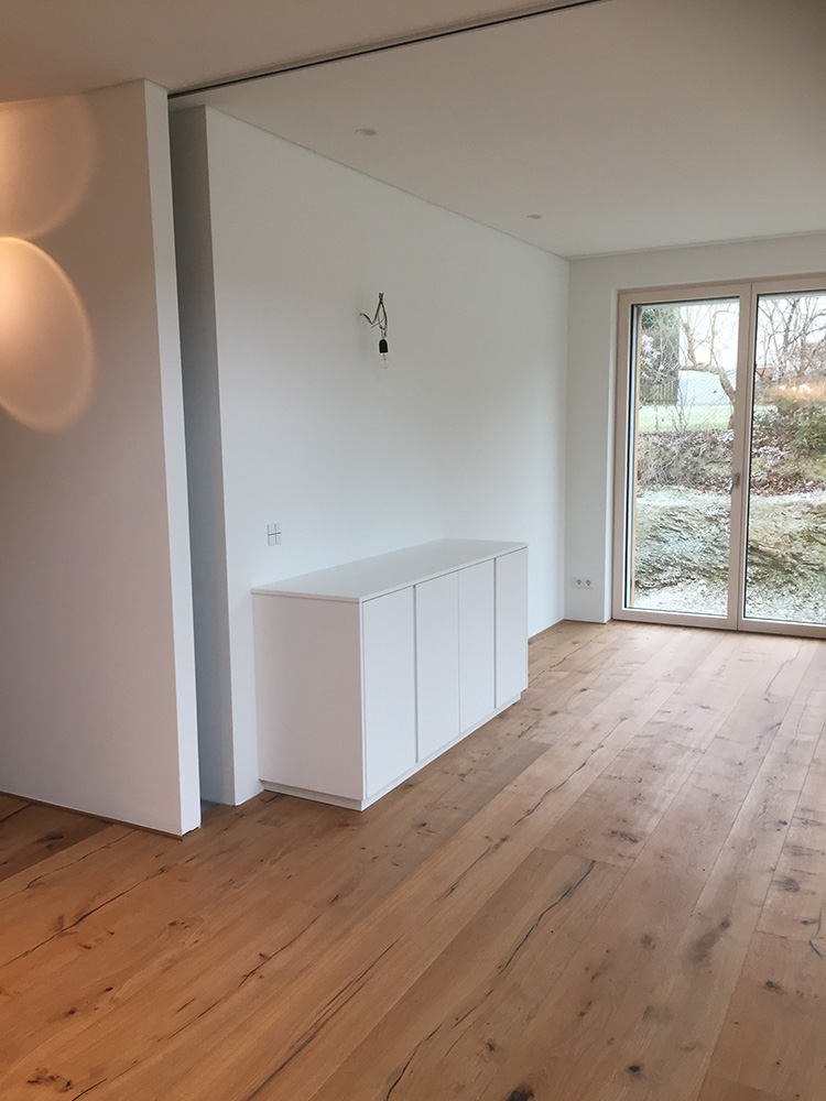 Die Bauherren kamen mit dem Wunsch nach einem Passivhaus in Holzbauweise und einem u-förmigen Entwurf zu uns. Bei näherer Betrachtung stellte sich heraus, dass der vorhandene Entwurf aufgrund von zu großer Hüllfläche und starker Eigenverschattung ungeeignet war, um als Plus-Energie-Haus zu funktionieren. Wesentliche Aspekte wie die günstige Ausrichtung zur Nutzung solarer Gewinne und geringe Wärmeverluste durch kompakte, wärmebrückenfreie Bauweise müssen bereits in der Entwurfsphase bedacht werden. In einem neuen Entwurf wurde der Baukörper so auf dem Grundstück platziert, dass - wie von den Bauherren gewünscht - ein abgeschirmter privater Freibereich entsteht. Die Wohnräume orientieren sich mit großen Öffnungen nach Süden zum eigenen Garten.