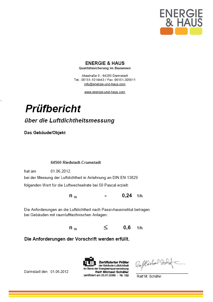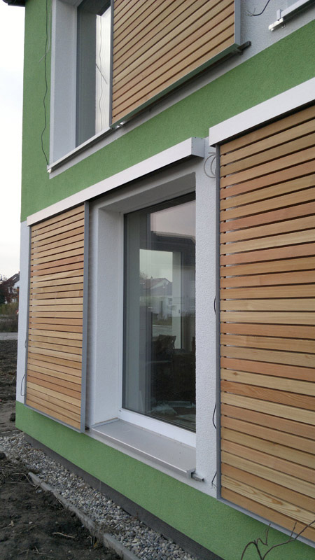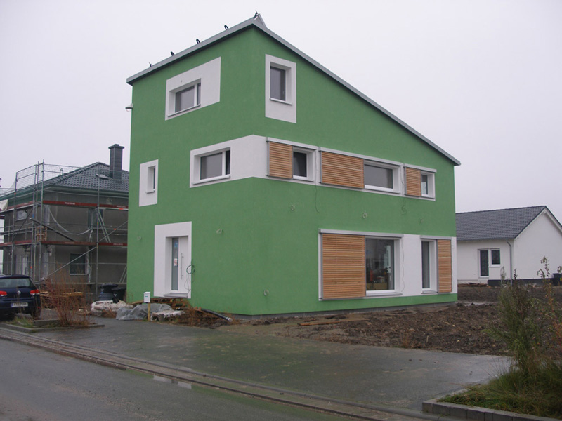 Dieses Plusenergiehaus ist ein qualitätsgeprüftes Passivhaus mit ca. 100m² Photovoltaikanlage und erzeugt mehr Strom als die Nutzer selbst verbrauchen. Weiterhin ist eine thermische Solaranlage installiert, die neben der Wärmepumpe mit Tiefenbohrung den Warmwasser- und den geringen Heizenergiebedarf deckt. Zusätzlich ist dieses ´Smart-Home´ mit Bus- und Netzwerktechnik zeitgemäß ausgestattet. Die Alu-/Holzschiebeläden sind mit einer intelligenten Steuerung dem Sonnenstand nachgeführt, sodass im Sommer verschattet und im Winter mittels auch bei Sonne geöffneten Schiebeläden (Temperaturvergleich) die gewünschte Solarwärme ins Hausinnere gelassen und gehalten wird.