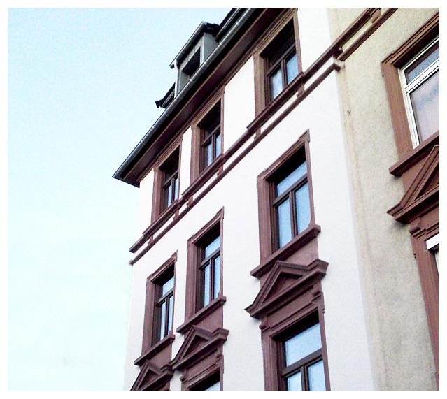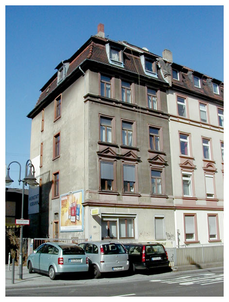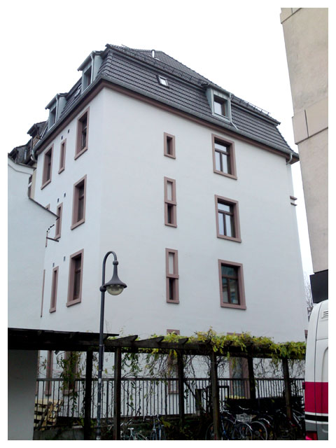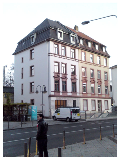 Dieses Gebäude aus der Gründerzeit zu sanieren und einen KfW-Effizienzhausstandard 100 zu erreichen war nur mit der Vorgabe Erhaltung der verzierten Straßenfassade gewünscht. Der Erhalt der Sandsteineinfassungen führte dazu, dass wie bei einem denkmalgeschützten oder als Kulturdenkmal ausgewiesenen Gebäude an der Straßenfassade keine Außendämmung, sondern eine Innendämmung verwendet wurde. Die Mietparteien haben z. T. in der Bauphase im Haus gewohnt. Das Gebäude steht in Frankfurt in Nähe einer vielbefahrenen Bahnstrecke und bietet den Mietern jetzt den Vorteil, dass sich der Schallschutz deutlich verbessert hat. Dies ist durch den Austausch der Fenster und die installierte zentrale Lüftungsanlage mit Wärmerückgewinnung die Räume mit Luft versorgt erreicht worden. Die hof- und giebelseitig angebrachte Dämmung ist so ausgeführt worden, dass die ursprünglichen Proportionen der Gründerzeitfassade erhalten geblieben sind. Eine neue zentrale Heizungsanlage versorgt die Einheiten nach der Sanierung mit nachhaltiger Wärme aus Holzpellets. Der Heizwärmebedarf ist durch die Maßnahmen um 75% reduziert.
