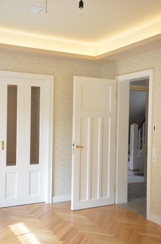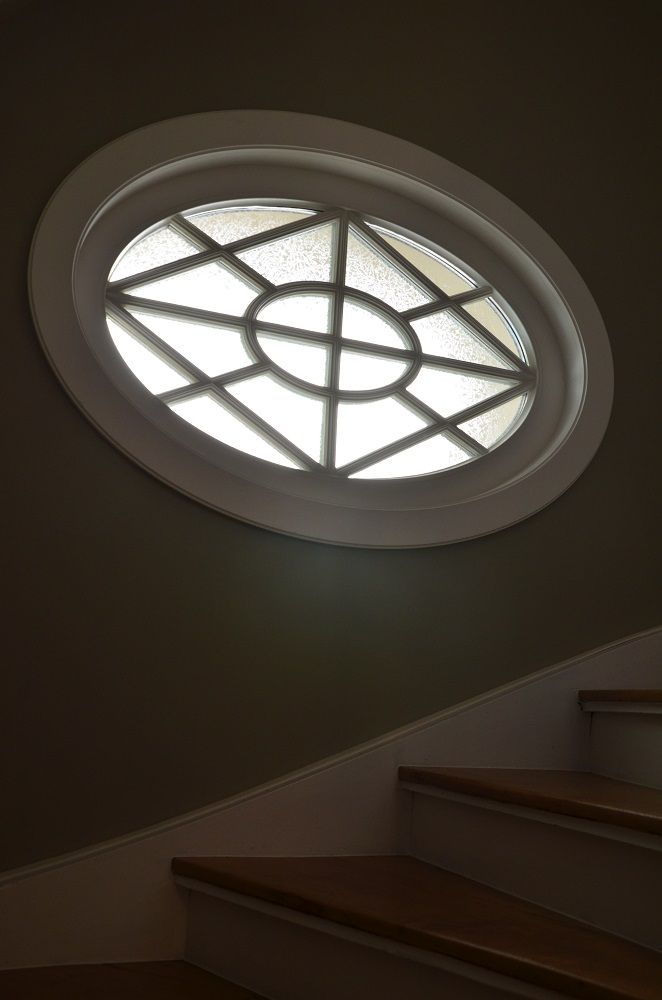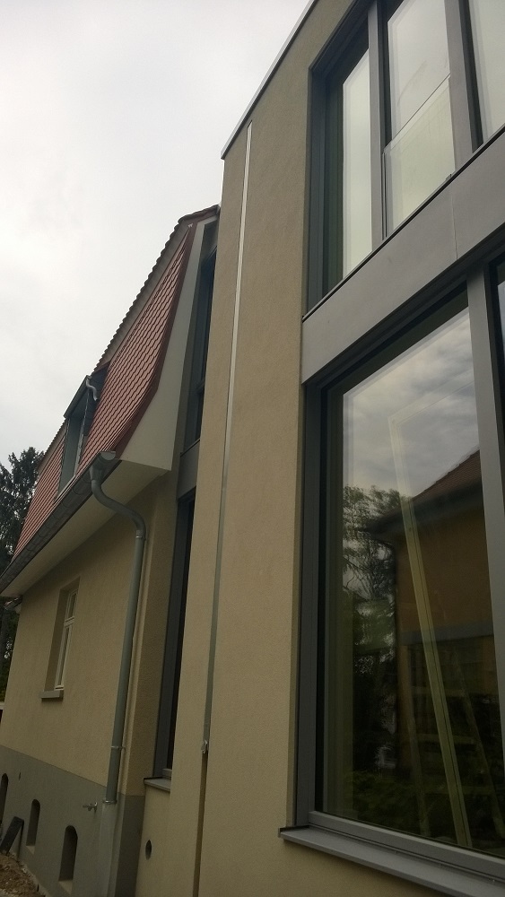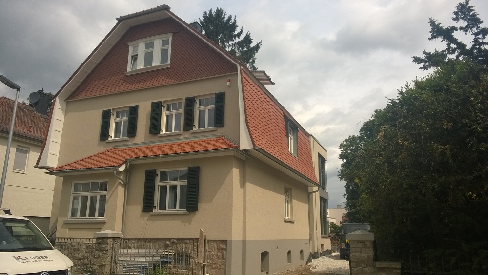 Anhand von zwei letzten erhaltenen Fenstern konnte die ursprüngliche Aufteilung der Sprossenfenster mit Holzklappläden rekonstruiert werden. In aufwendiger Detailarbeit am 1:1 Modell gelang es auch, das Oval im Treppenhaus in identischer Proportion in die Zukunft zu retten: mit 3-fach-Verglasung! Denn der Stand von 1927 (Einfachverglasung) konnte nicht das Ziel sein. Das gesamte Ensemble erreicht das KfW-Effizienzhaus-70-Niveau und übertrifft damit den aktuellen Baustandard deutlich. Dank akribischer Detailplanung und Baubegleitung konnte die ursprüngliche Proportion und das historische Erscheinungsbild mit filigraner Dachkante trotz erhöhtem Dämmstandard wiederhergestellt werden.