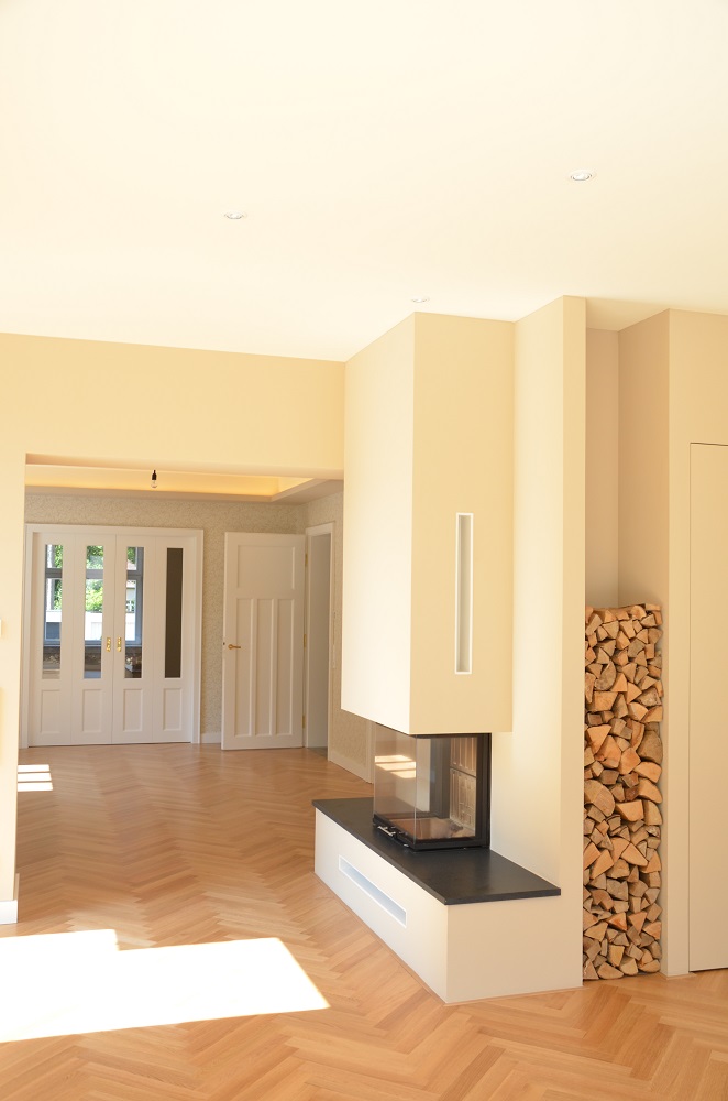 Als Erweiterung wurde dem in neuem Glanz erstrahlten Kleinod ein schlichter Kubus mit großen Verglasungen zum Garten zur Seite gestellt. Durch die Anpassung der Grundrisses konnten auch zeitgemäße Wohnansprüche erfüllt werden. Eine zentrale Lüftungsanlage mit Wärmerückgewinnung und ein Pelletkessel mit Fußbodenheizung sorgen für den zukunftsfähigen Komfort.