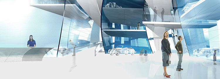 Die mittlerweile realisierte Idee für den Umbau des BMW-Museums in der „Schüssel“ wurde im Vorfeld mittels 3-D Visualisierungen vorgestellt. Um Oldtimer und technische Stationen auf dem Weg zu heutigen BMW-Modellen optimal zu präsentieren wurde der Museumsraum offen, transparent und mit vielen Blickbezügen gestaltet. Der Entwurf stammt aus dem Hause ´Atelier Brückner´, Stuttgart.